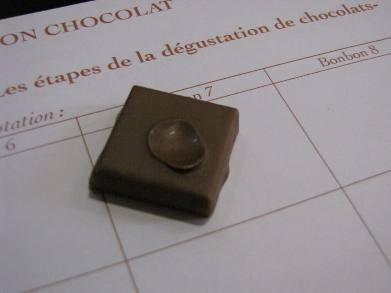 - Le premier bonbon proposé s’appelle La Provence. C’est une ganache thym et miel. A l’œil nous voyons un bonbon carré avec des petits points verts. La prédominance est le thym sur le miel moins prononcé..Le chocolat utilisé est un chocolat noir du Venezuela. Pas trop de longueur en bouche, mais choisi exprès pour débuter la dégustation. Nous apprenons un terme pas encore connu dans notre répertoire de dégustateur : une saveur herbue.