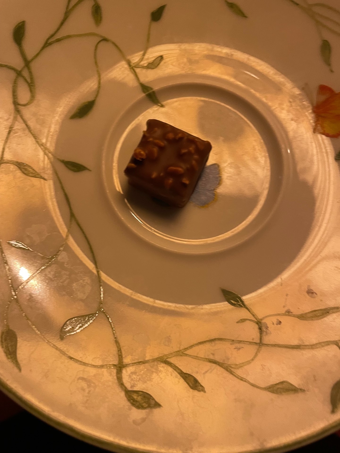 - Le praliné suivant a un décor avec comme une noisette à l’intérieur mais c’est de la cacahuète grillée salée on pense à du halva. Il est croustillant.