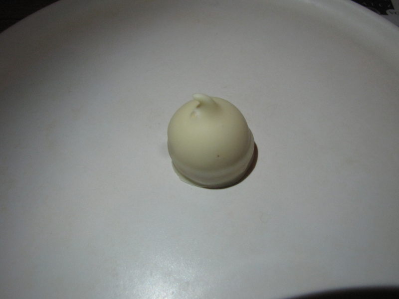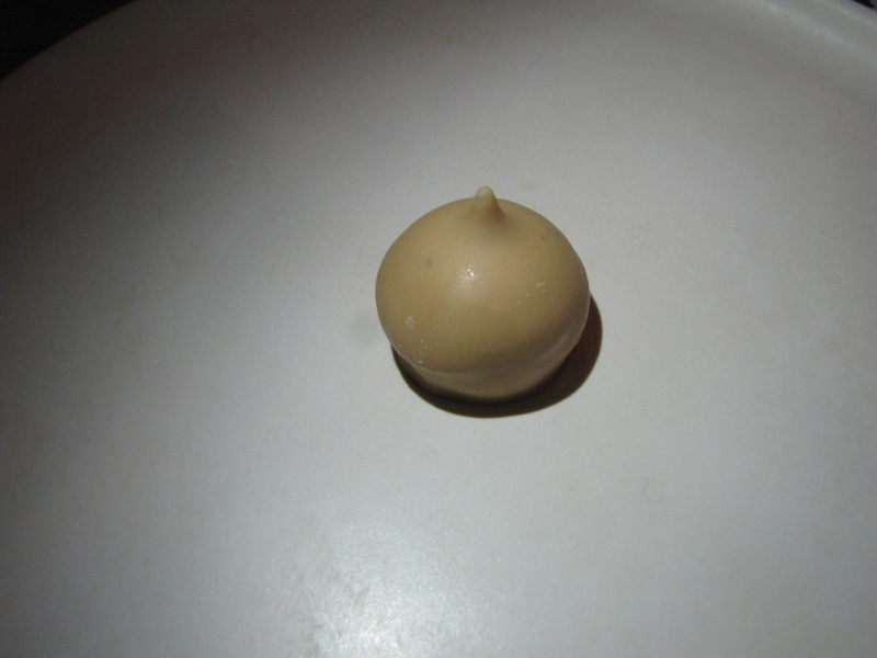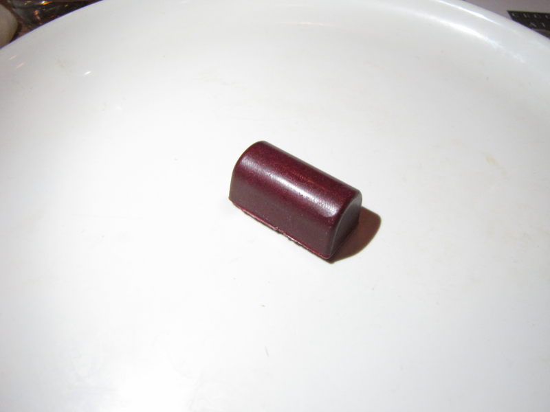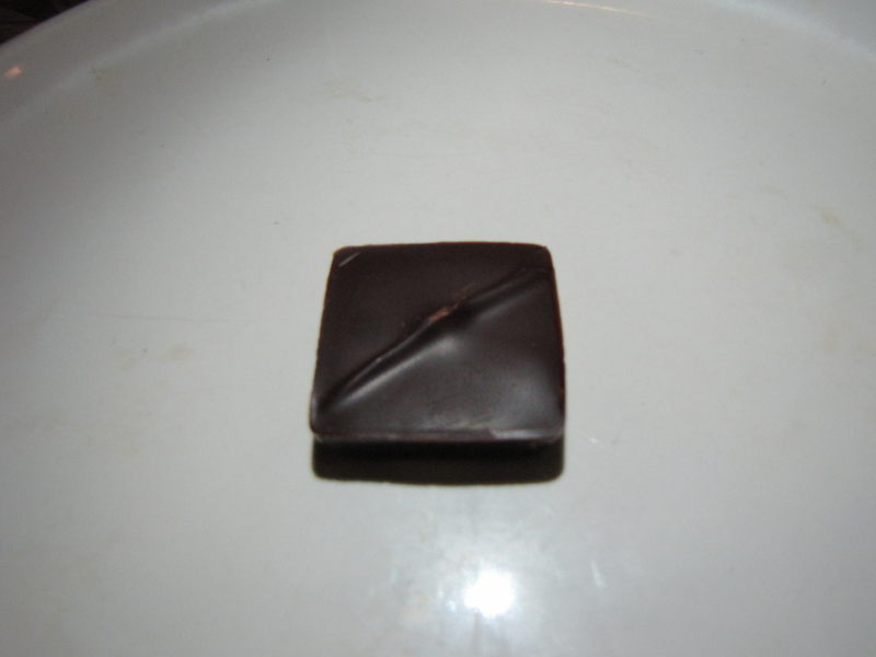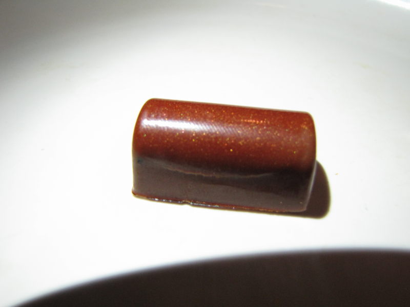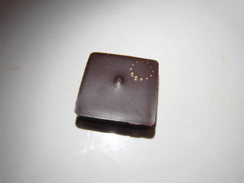 Le bonbon suivant, de même forme à un décor d’un une petite pastille dorée qui ressort sur le chocolat noir. C’est ce qui correspond au palais or, c’est une ganache pure origine Équateur, nature. La Couverture est très fine et fondante. C’est un chocolat grand cru Arriba à 72 %, il a des notes fruitées, un peu banane, il est particulièrement rond et n’a pas d’amertume. Celui-ci et le précédent ont été les plus appréciés.