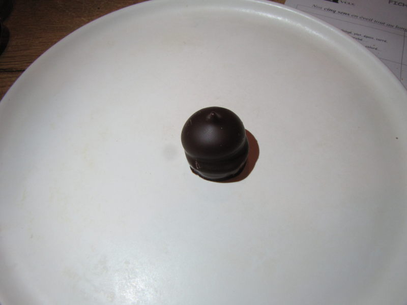 Nous continuons notre dégustation avec la gamme Beaujolette Forme de petit tonneau. Sa couleur est acajou avec des paillettes de couleur violette. C’est une ganache au Beaujolais, mûre et menthe. Le vin utilisé est un Brouilly Château Lachaise. Ses tanins sont légers. Le chocolat provient de Madagascar. Nous terminons par la gamme Les P’tites Pâtisseries.