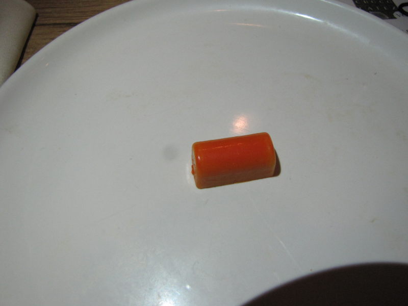 Le suivant est un chocolat en forme de petit rectangle ou de petit tonneau comme le précédent qui a des reflets dorés. C’est un chocolat au lait 42% de Agri Cacao d’origine Cameroun. Il est à la noisette et cèpes. De belles notes de sous-bois, champignons.
