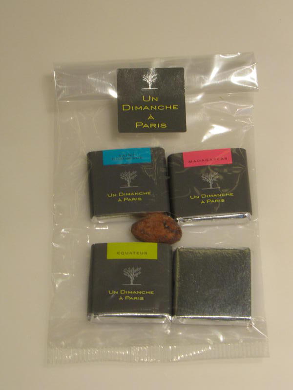 C’est dans la boutique au plafond rappelant la canopée et le milieu originel du cacao que nous avons débuté notre dégustation. Chaque participant s’est vu remettre un sachet individuel contenant une fève « pur Vénézuela » ainsi que 4 carrés de chocolat. Le premier a parfaitement mis en évidence les caractéristiques forales que l’on attend d’un « cacao nacional arriba ».