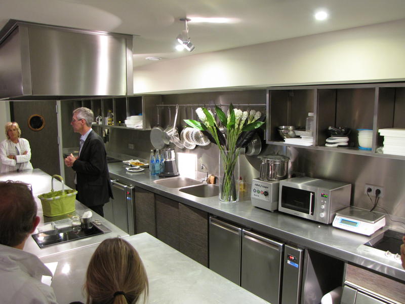 La visite s’est conclue dans « la grande cuisine » qui sert aux cours de cuisine mais également aux dîners organisés pour des groupes. Nous y avons fait une deuxième dégustation avec trois bonbons de chocolat noir. Notons les traits communs à toute la gamme : une couverture très fine, un poids de 8g, une taille restreinte, une forme carrée et l’absence de décalcomanie pour le décor. En fonction de la nature du bonbon désiré, cinq couverturiers différents sont sollicités. La première ganache nature, déclinaison du carré de chocolat « pur cru Madagascar » précédemment dégusté, nous a étonné par sa note marquée de caramel. Le deuxième bonbon renfermait des saveurs de cannelle et de muscade expliquant son appellation « épices douces ». Pour conclure, une ganache au citron nous a permis d’apprécier la réussite d’un subtil équilibre entre fruit et chocolat.