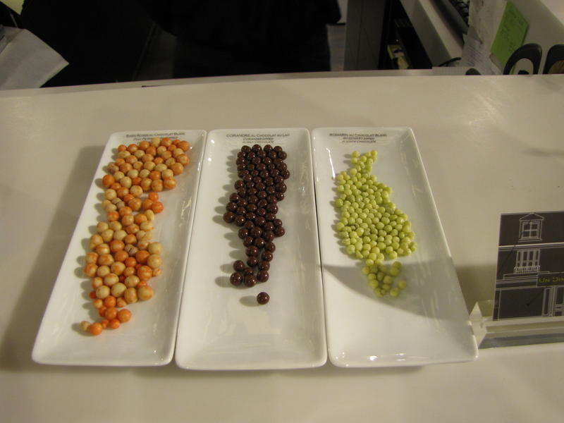 Pour n’en citer que quelques unes, évoquons les macarons, gâteaux de voyage, tablettes et d’autres spécialités plus surprenantes comme les billes épicées. Nous avons eu en effet la chance d’expérimenter des baies roses et du romarin enrobés de chocolat blanc ainsi que de la coriandre associée à du chocolat au lait.