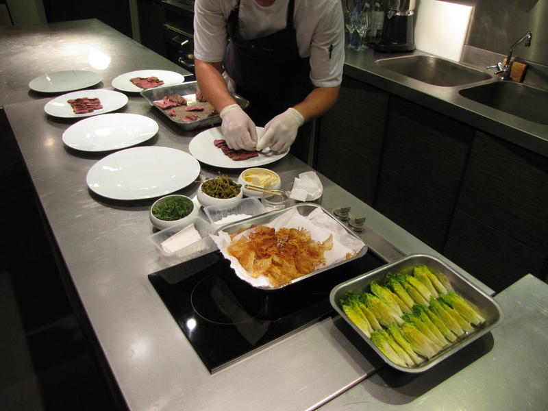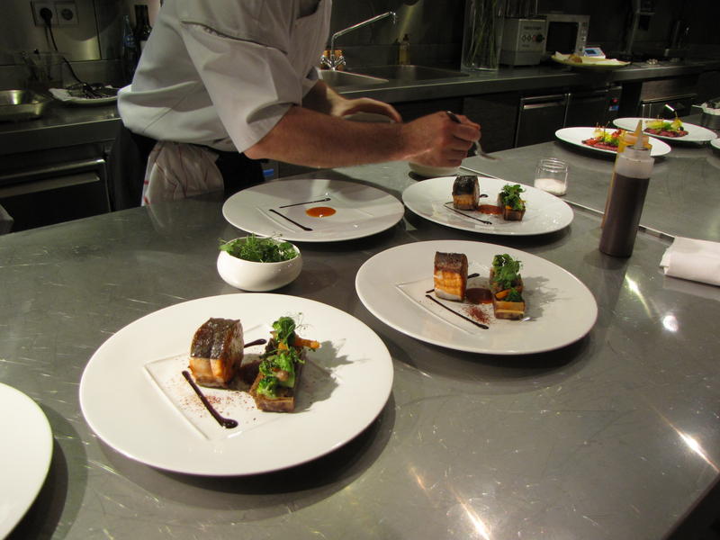 Installés confortablement, les membres de l’association ont alors savouré une verrine de soupe de tomate agrémentée d’une chantilly au chocolat. Cette mise en bouche accompagnée d’un verre de Bordeaux blanc château Lachèze, nous a permis de patienter pendant que l’équipe des cinq pâtissiers/chocolatiers confectionnaient sous nos yeux le menu proposé ce soir.
